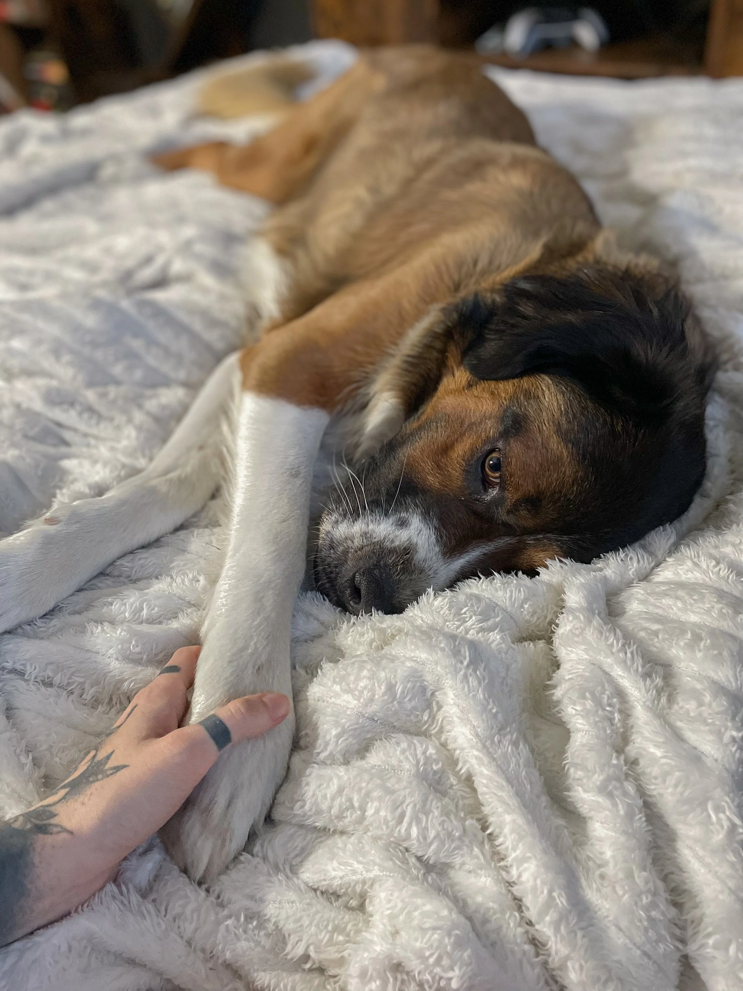 Violet souffre d’une maladie chronique de la vessie (ce qui signifie un traitement quotidien à vie), de gros problèmes aux deux pattes avant, et ses genoux et hanches arrière veulent eux aussi se joindre au party ! Elle n’est encore qu’un chiot, mais physiquement, c’est comme si elle avait 20 ans; pas de cartilage, de l’arthrite sévère partout et de la difficulté à marcher ou sauter.